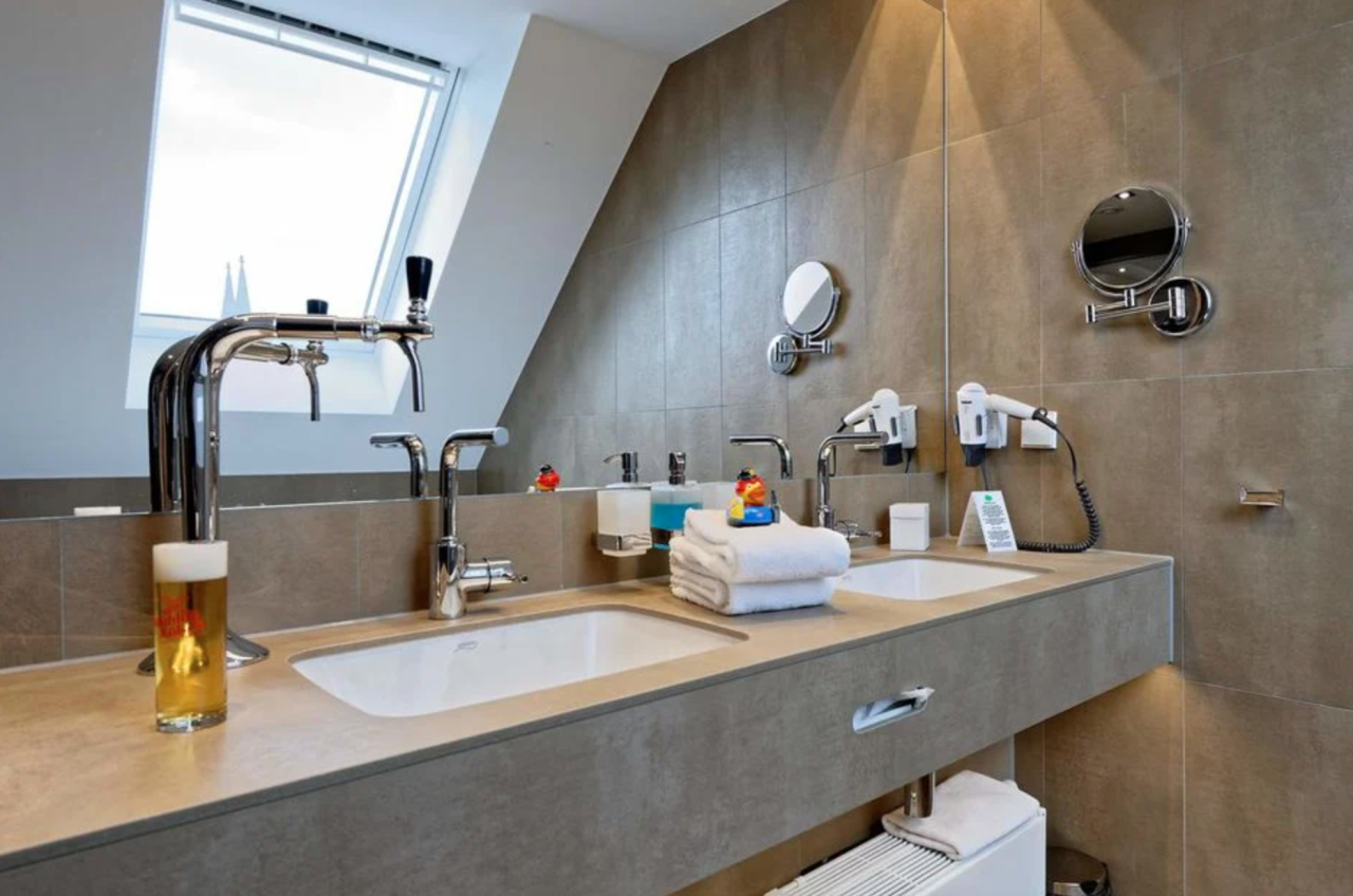 Un petit hôtel à Cologne, en Allemagne, propose des chambres avec une salle de bain un peu particulière... Il y a une tireuse à bière juste à côté du lavabo !