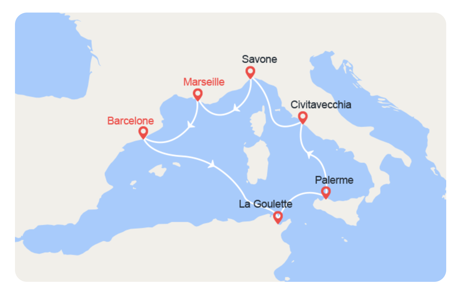 Itinéraire : Marseille → Barcelone (Espagne) → La Goulette / Tunis (Tunisie) → Palerme (Sicile, Italie) → Civitavecchia / Rome (Italie) → retour à Marseille