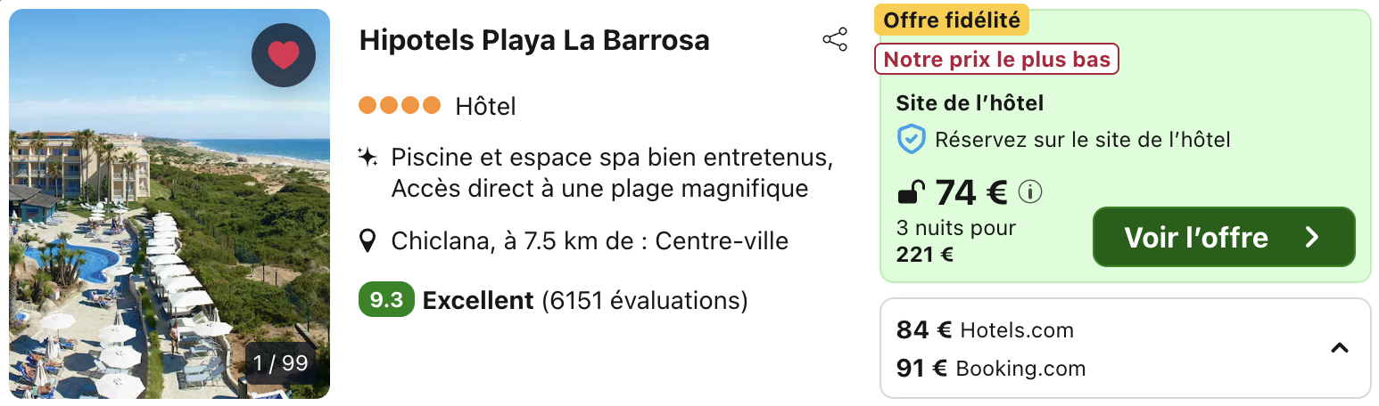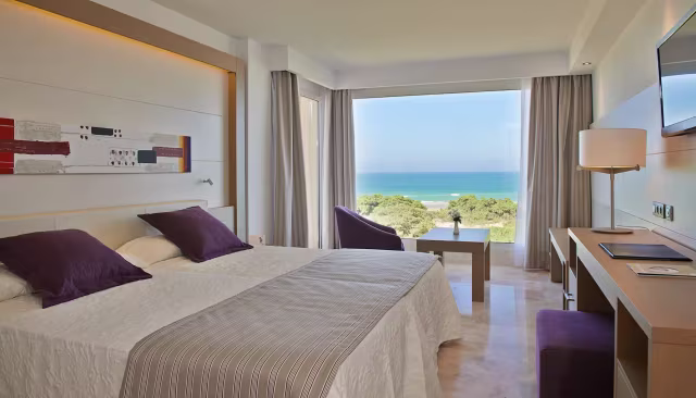 Équipements : Hôtel 4 étoiles en bord de mer / Accès direct à la plage de La Barrosa / Piscines extérieures / Spa complet avec sauna, hammam et soins / Salle de sport / Restaurants buffet et à la carte / Bars avec terrasse / Animations et spectacles / Parking gratuit
