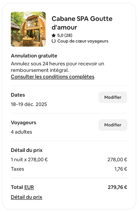 Exemple de séjour du 18 au 19 décembre 2025 :