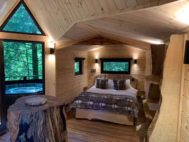 Passez la nuit dans une cabane dans les arbres ultra cosy avec jacuzzi et sauna privĂ©s donnant sur la forĂȘt.