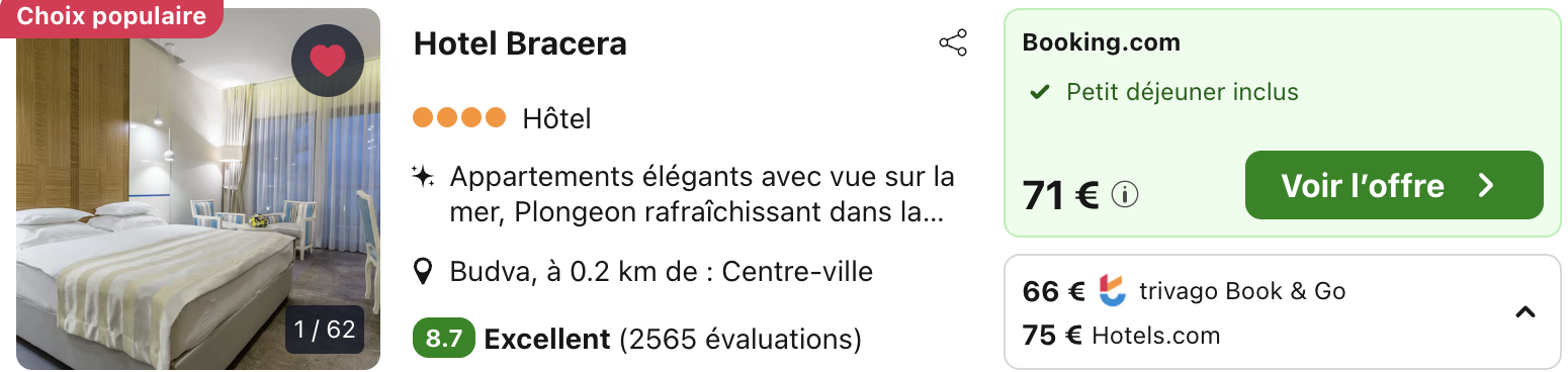 DÚs 35⏠par personne, dormez au superbe Hotel Bracera, un hÎtel spa moderne avec piscine intérieure, sauna, centre de remise en forme et petit-déjeuner inclus. Vous serez à quelques pas de la plage et du centre-ville, idéal pour explorer Budva et profiter de la cÎte monténégrine.