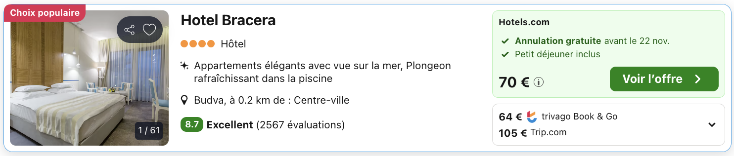 DÚs 32⏠par personne, dormez au superbe Hotel Bracera, un hÎtel spa moderne avec piscine intérieure, sauna, centre de remise en forme et petit-déjeuner inclus. Vous serez à quelques pas de la plage et du centre-ville, idéal pour explorer Budva et profiter de la cÎte monténégrine.