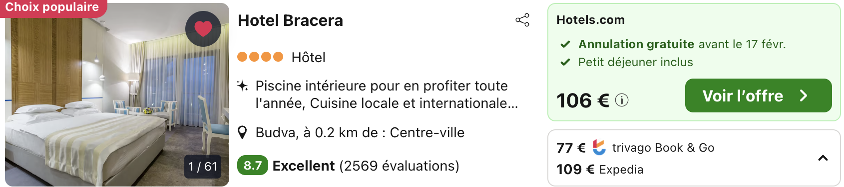 DÚs 53⏠par personne, dormez au superbe Hotel Bracera, un hÎtel spa moderne avec piscine intérieure, sauna, centre de remise en forme et petit-déjeuner inclus. Vous serez à quelques pas de la plage et du centre-ville, idéal pour explorer Budva et profiter de la cÎte monténégrine.