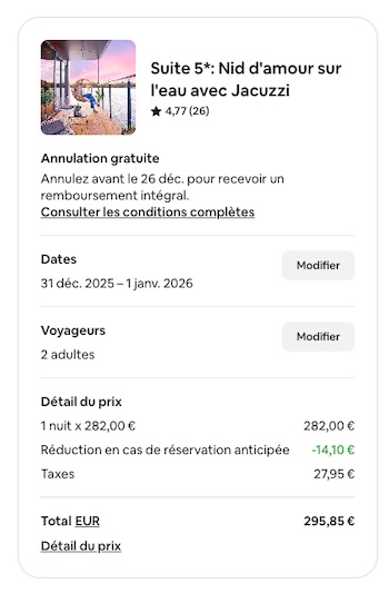 Nom de l'établissement : Suite 5*: Nid d'amour sur l'eau avec Jacuzzi