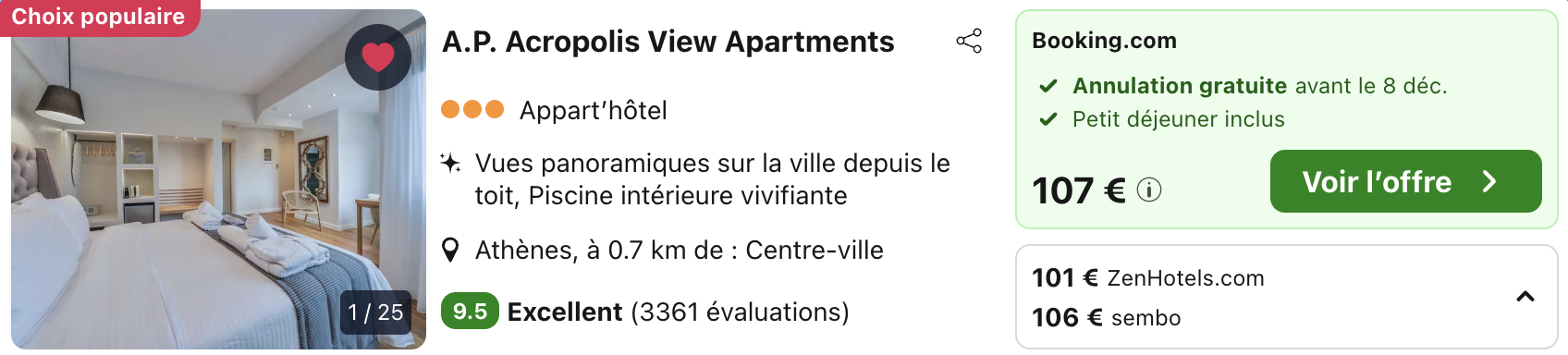 On vous embarque à Athènes pour une nuit (ou plus si affinités 👀) au AP Acropolis View Apartments, un très bel hôtel avec une vue incroyable sur l'Acropole. Le tout avec petit-déjeuner inclus, annulation gratuite, sauna, et même une option bain à remous dans certaines chambres pour buller comme un dieu de l’Olympe.