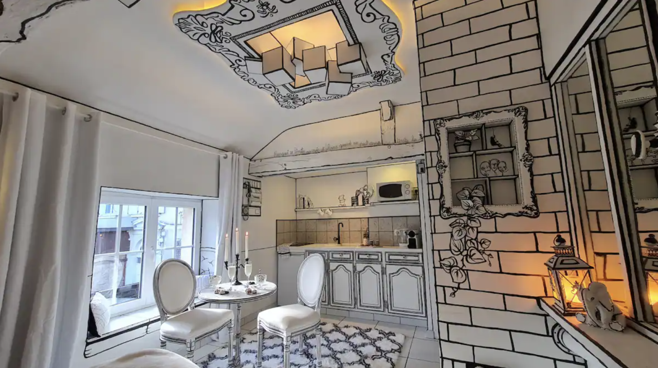 Tout en noir et blanc, tel un dessin, oubliez vos repères et plongez dans une immersion dans l’image. Laissez-vous surprendre par ce logement à la lumière tamisée, plein d'humour et de détails insolites !