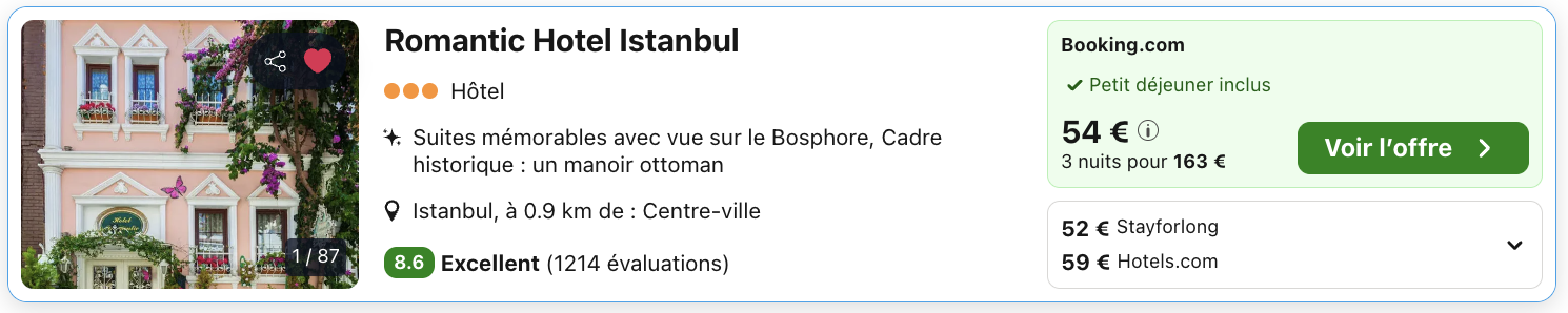 Vous passerez vos aprĂšs-midi Ă explorer les bazars, hammams, ruelles parfumĂ©es dâĂ©pices, et vos soirĂ©es Ă goĂ»ter les mezzĂ©s et le thĂ© turc sous les Ă©toiles. Et tout ça pour seulement 78 ⏠par personne : une escapade de rĂȘve Ă Istanbul Ă prix doux.