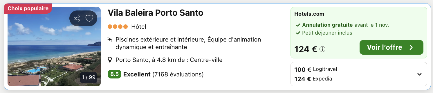 Nous avons repéré une super offre à l’hôtel Vila Baleira Porto Santo 4*, un superbe hôtel avec 3 piscines, plage privée, spa, restaurants,...où vous pourrez séjourner dès 50€ la nuit avec petits-déjeuners inclus.