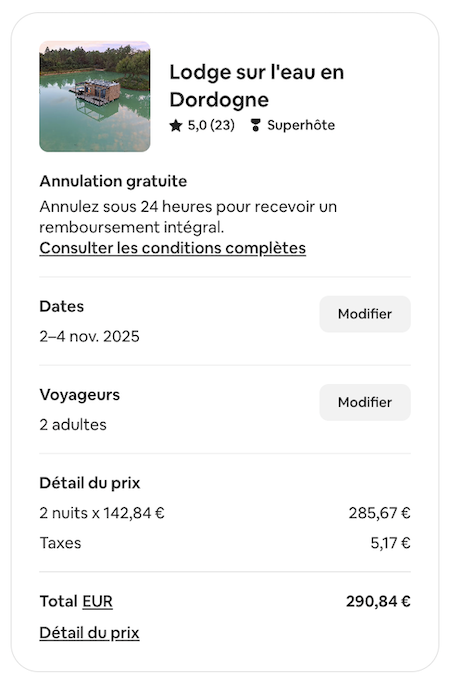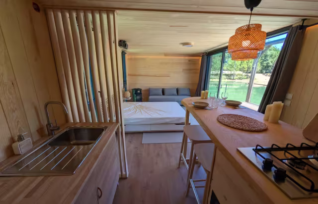 Imaginez-des matinées où l’on ouvre les fenêtres sur l’eau, des après-midi en terrasse avec le reflet des arbres, et des soirées douces entre rires et calme. Vous serez hébergés pour seulement 145€ par personne (sur la base de 2 voyageurs) : un tarif ultra-accessible pour une expérience si rare.