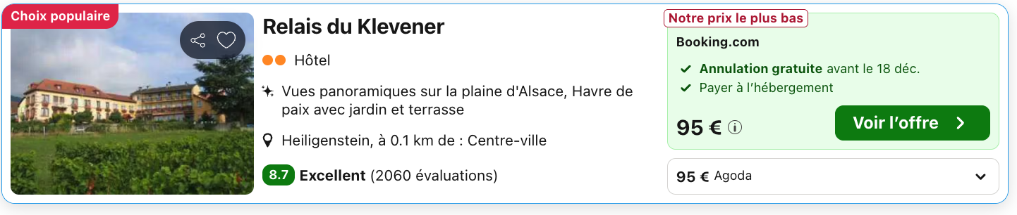 Une petite adresse chaleureuse sur les hauteurs du vignoble, idéale pour une première nuit au calme après Strasbourg. Chambres simples, typiques et atmosphère paisible au cœur de la route des vins.