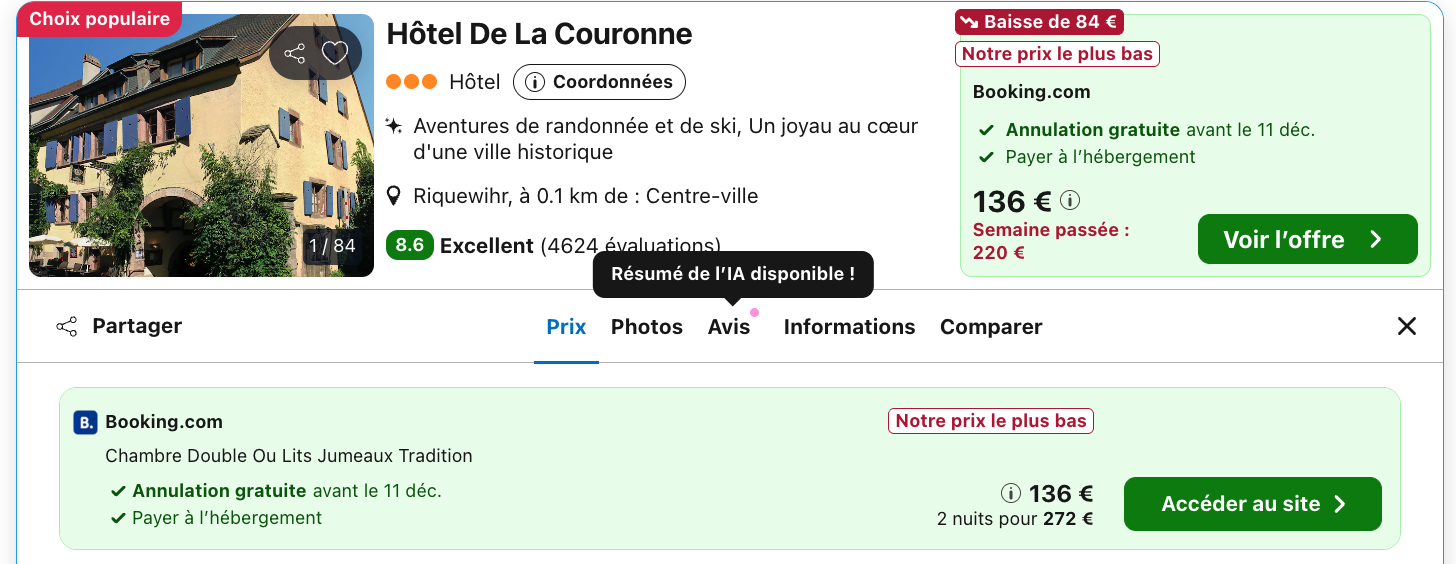 Puis vous prenez la route vers le sud, en longeant les villages qui s’illuminent dès la fin d’après-midi. Votre point de chute : Riquewihr, où vous séjournerez à l’Hôtel de La Couronne, installé dans une bâtisse du XVe siècle. Un décor alsacien typique, des poutres anciennes, et surtout la possibilité de laisser la voiture au parking pour profiter des navettes spéciales marchés de Noël. Rien à organiser : vous vous laissez porter.