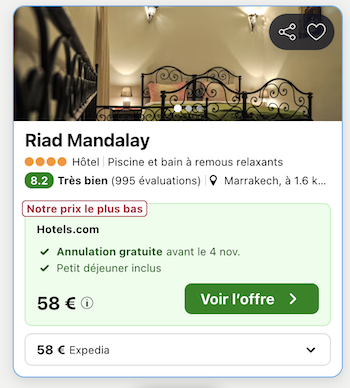 À partir de 29€ par personne seulement, bénéficiez d’un hébergement 4* avec piscine, petit-déjeuner inclus et annulation gratuite. Une occasion unique de s’offrir une escapade marocaine alliant confort, charme oriental et petit prix.