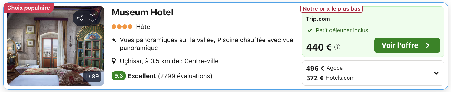 C’est un établissement Relais & Châteaux au standing irréprochable, avec même une cave/vinothèque sur place pour des dégustations locales. Oui, 220€ par personne peut sembler un peu élevé au premier abord, mais vu l’emplacement, le charme unique des chambres et les services haut de gamme, le rapport qualité-prix est très solide. Bref : si vous cherchez une expérience Cappadocienne mémorable (confort, panorama et design historique), c’est clairement une valeur sûre. ❤️
