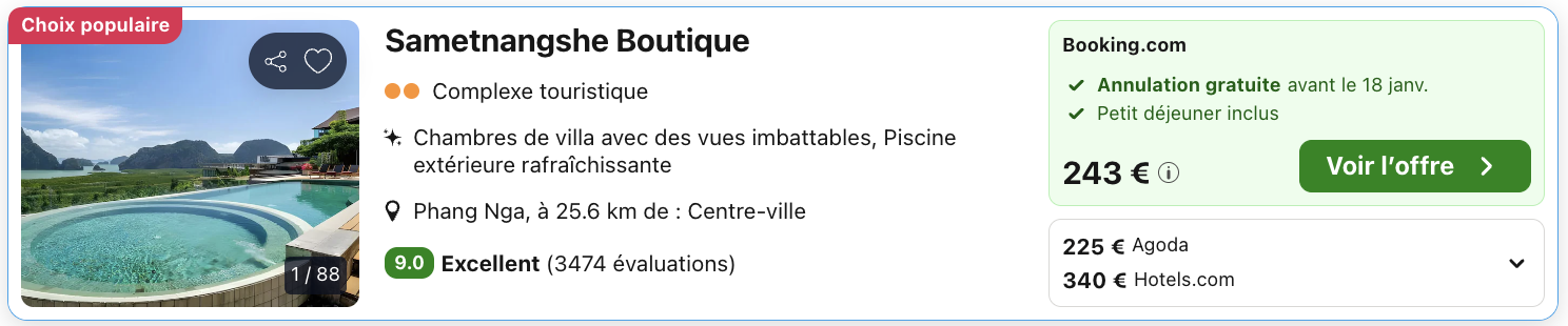 Direction le Sametnangshe Boutique, un magnifique hôtel 4 étoiles avec une vue à couper le souffle sur la baie de Phang Nga 🌅. Imaginez-vous savourer un petit-déjeuner avec ce paysage magique en toile de fond, ou vous détendre au bord de la piscine à débordement en profitant du calme absolu... un vrai rêve éveillé 💭