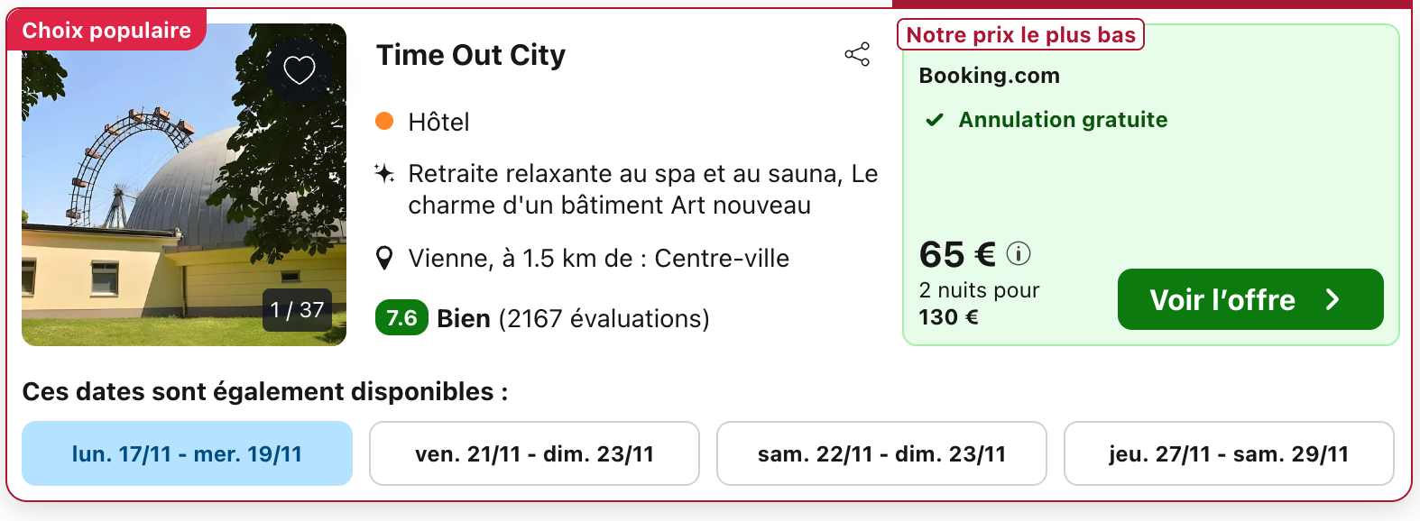 A noter : les prix sont corrects au moment de la publication, sur la base des exemples de dates fournis, et sont soumis à des fluctuations, en fonction des disponibilités.