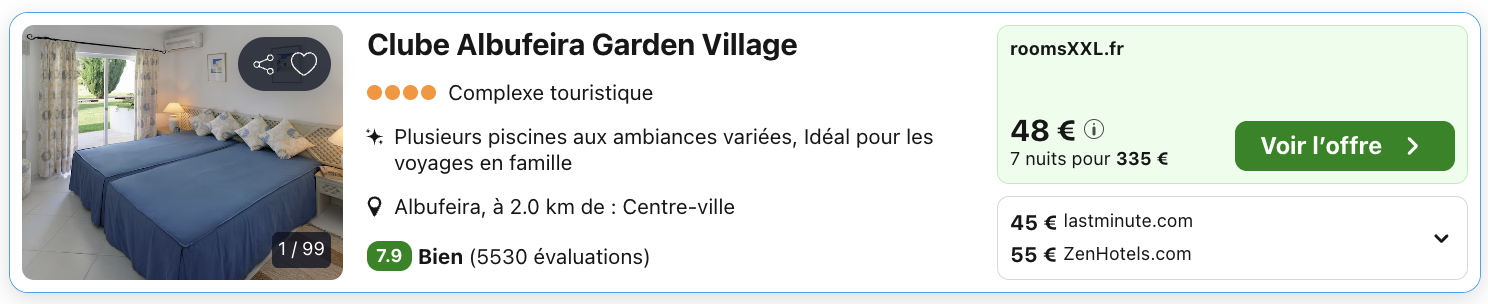 A noter : les prix sont corrects au moment de la publication, sur la base des exemples de dates fournis, et sont soumis à des fluctuations, en fonction des disponibilités.