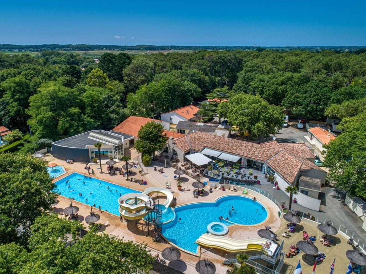 Équipement : Espace aquatique de 640m2 avec grand bassin extérieur, toboggans, pataugeoire, et piscine couverte chauffée avec bain bouillonnant / mini-clubs / restaurant / plats à emporter / snack-bar / supérette