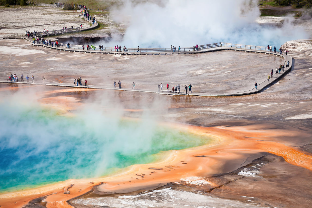 Le Grand Prismatic Spring, situé dans le parc national de Yellowstone aux États-Unis, est l'une des merveilles géothermiques les plus emblématiques du monde. Ses eaux turquoise et ses couleurs vibrantes, allant du bleu profond au rouge orangé, créent un spectacle naturel à couper le souffle. En tant que plus grande source chaude des États-Unis et troisième plus grande du monde, le Grand Prismatic Spring est une destination incontournable pour les amateurs de nature et de géologie.