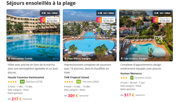 Du 24 novembre au 2 décembre 2025, leurs offres vol + hôtel profitent d’une réduction jusqu’à 250€ grâce aux codes promotionnels, en plus des rabais déjà appliqués sur les hôtels.