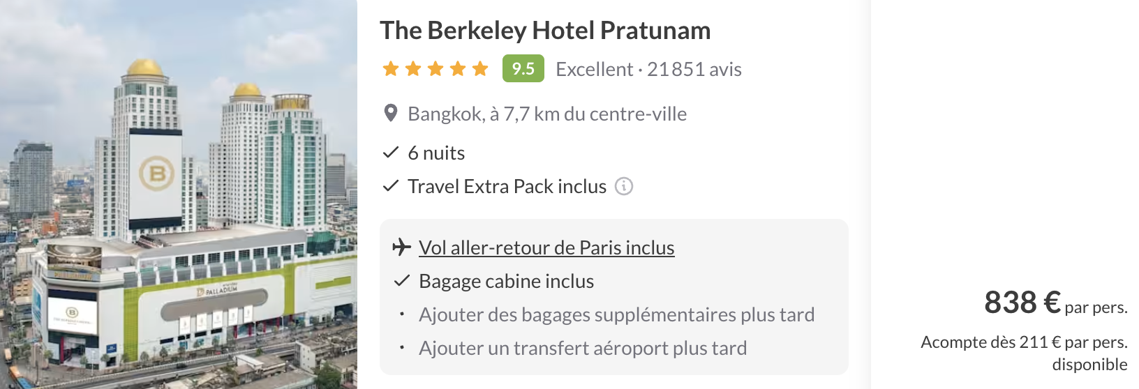 Je vous ai dĂ©nichĂ© un super plan pour partir une semaine complĂšte avec vols A/R inclus dans le trĂšs beau The Berkeley Hotel Pratunam 5 Ă©toiles, idĂ©alement situĂ© au cĆur de la capitale.