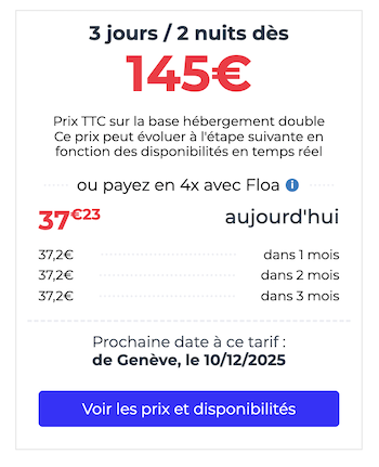 A noter : les prix sont corrects au moment de la publication, sur la base des exemples de dates fournis, et sont soumis à des fluctuations, en fonction des disponibilités.