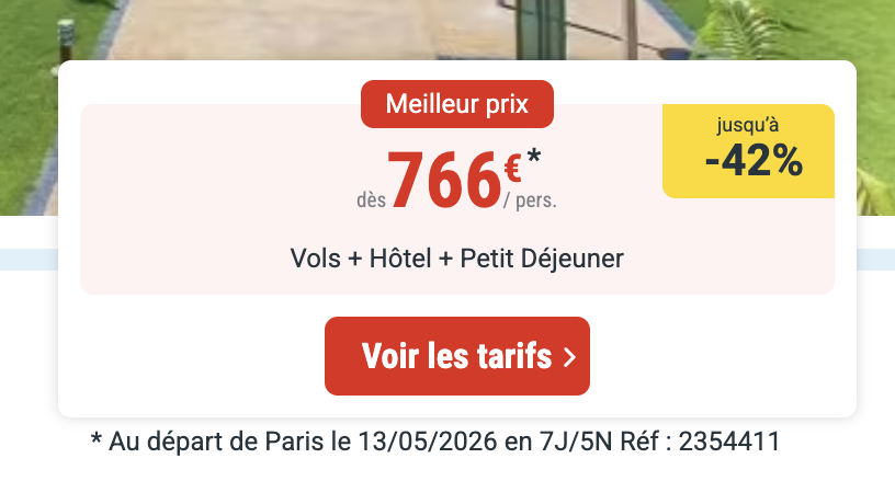 À noter : les prix sont corrects au moment de la publication, sur la base des exemples de dates fournis, et sont soumis à des fluctuations, en fonction des disponibilités.