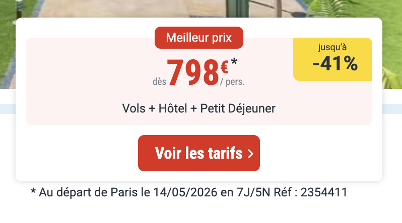 à noter : les prix sont corrects au moment de la publication, sur la base des exemples de dates fournis, et sont soumis à des fluctuations, en fonction des disponibilités.