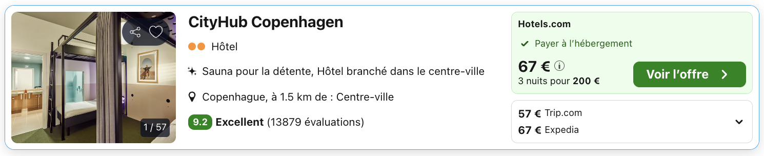 Hôtel = 171€/2 personnes = 85,5€ p.p.