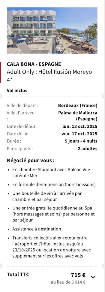 Exemple de séjour depuis Toulouse du 13 au 17 octobre 2025 :