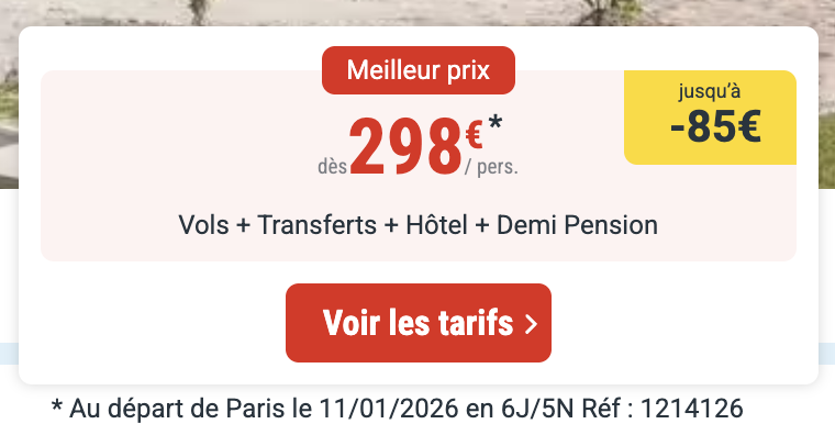 Les vols aller-retour directs sont compris dans l’offre, ainsi que les transferts : vous n’avez qu’à poser vos valises et profiter. Entre balades sur la plage, marchés typiques et pause spa, ce séjour combine farniente et découvertes culturelles : le tout pour seulement 298€ par personne.