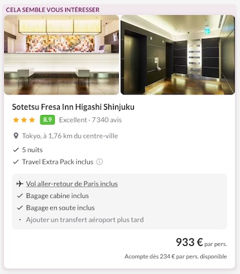 💡 Le bon plan pirate : Une semaine au Japon avec vols A/R inclus, central à Tokyo, hôtel bien noté, parfait pour découvrir la ville sans stress et à prix mini.