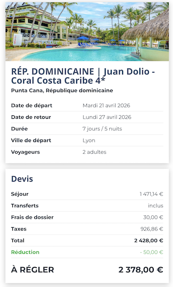 Exemple de séjour depuis Paris avec bon de réduction appliqué :