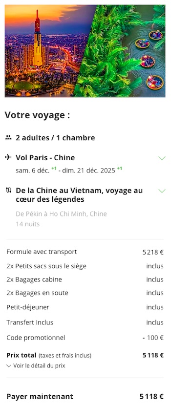 Le prix comprend les vols A/R, plusieurs transferts, le vol Pékin - Hanoï en classe économique, les hébergements et les petits-déjeuners.