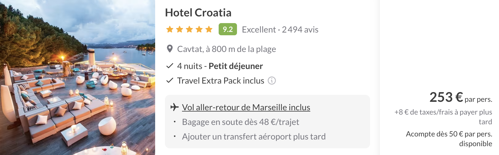 La cerise sur le gâteau ? Le petit-déjeuner et les vols A/R sont inclus, annulation gratuite, et disponibilité pendant les vacances de Pâques. Impossible de résister à ce combo confort, soleil et mer Adriatique à petit prix.