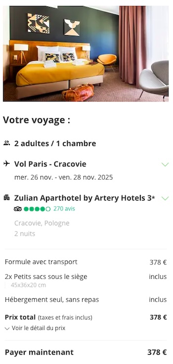 Exemple de séjour du 26 au 28 novembre 2025 depuis Paris :