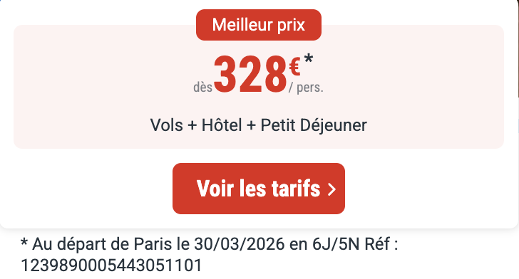 À noter : les prix sont corrects au moment de la publication, sur la base des exemples de dates fournis, et sont soumis à des fluctuations, en fonction des disponibilités.