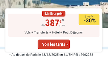 À noter : les prix sont corrects au moment de la publication, sur la base des exemples de dates fournis, et sont soumis à des fluctuations, en fonction des disponibilités.