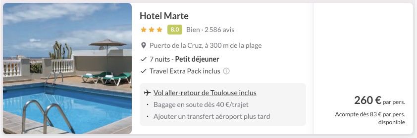 A noter : les prix sont corrects au moment de la publication, sur la base des exemples de dates fournis, et sont soumis à des fluctuations, en fonction des disponibilités.