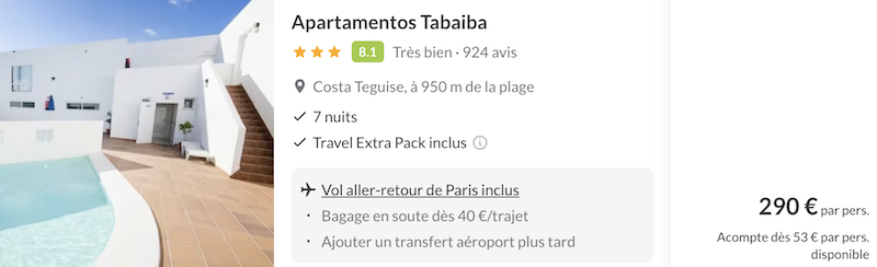 Et le petit détail qui fait plaisir : les vols A/R directs sont inclus, donc vous atterrissez, vous plongez dans la piscine… et la semaine commence en mode farniente. Le tout pour seulement 290€ par personne : oui, 7 jours au paradis à prix mini. 🔥