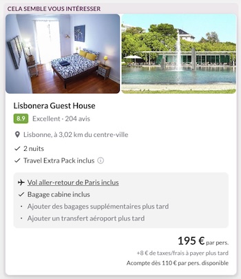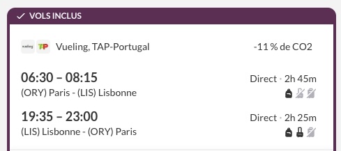 Le prix comprend les vols A/R avec des horaires optimisés. Vous arriverez à Lisbonne à 8h15 et repartirez le 3Úme jour à 19h35. Vous pourrez donc profiter de 3 jours entiers sur place sans payer une 3Úme nuit d'hÎtel. C'est une astuce pirate comme on les aime !