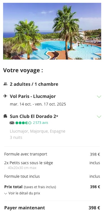 Cliquez pour voir les villes de départ et modifier le nombre de nuits. Vous pouvez payer ce séjour en 2x ou 4x et partir jusqu'au mois d'octobre.