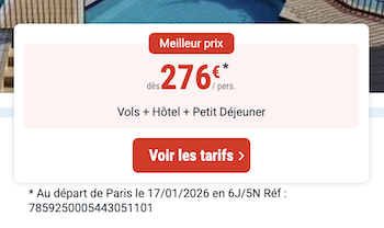 À noter : les prix sont corrects au moment de la publication, sur la base des exemples de dates fournis, et sont soumis à des fluctuations, en fonction des disponibilités.