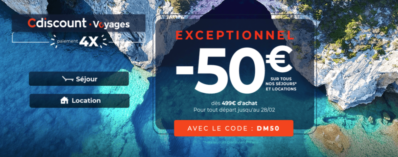 Vous pourrez bénéficier de 50€ de réduction dès 499€ d’achat sur toutes les offres (sauf train et séjours Disneyland Paris) grâce au code promo DM50.