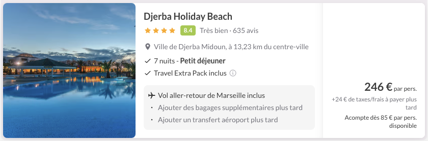 A noter : les prix sont corrects au moment de la publication, sur la base des exemples de dates fournis, et sont soumis à des fluctuations, en fonction des disponibilités.
