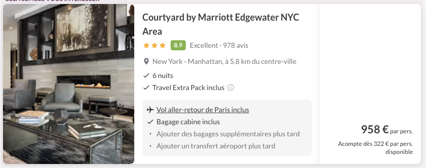 Partez pour 7 nuits Ă New York avec vols A/R inclus ! Vous logerez au Courtyard by Marriott Edgewater NYC Area, un hĂŽtel moderne et trĂšs bien notĂ©, situĂ© Ă Edgewater, New Jersey, avec une vue incroyable sur la skyline de Manhattan. Profitez de la piscine intĂ©rieure chauffĂ©e pour vous dĂ©tendre, dâune salle de sport et dâun rooftop parfait pour un verre en admirant le panorama urbain. Lâemplacement idĂ©al Ă quelques minutes de Manhattan vous permet de rejoindre facilement les incontournables comme lâEmpire State Building, Times Square ou la High Line. Un super plan pour allier dĂ©couverte, dĂ©tente et confort, le tout Ă prix malin ! âïžđșđž