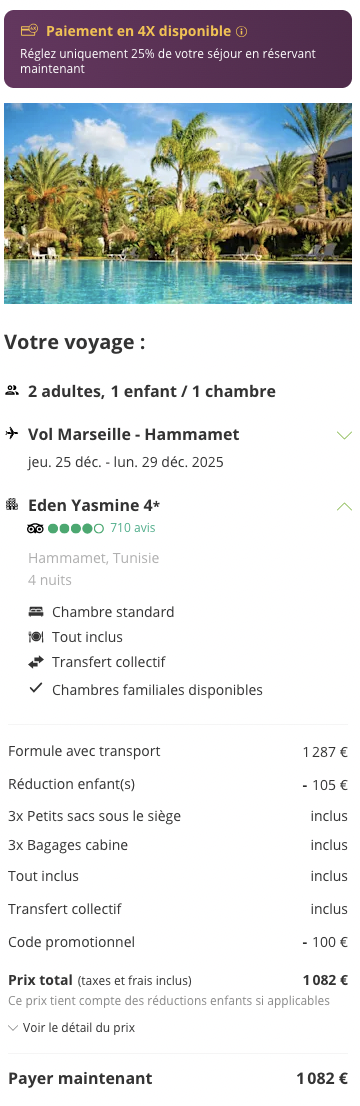 Offrez-vous des vacances de NoĂ«l en famille, au soleil ET Ă prix doux grĂące Ă ce bon plan ! Direction Hammamet, perle du littoral tunisien, pour un sĂ©jour de 5 jours en formule tout inclus Ă lâhĂŽtel Eden Yasmine 4* â vols A/R et transferts compris.