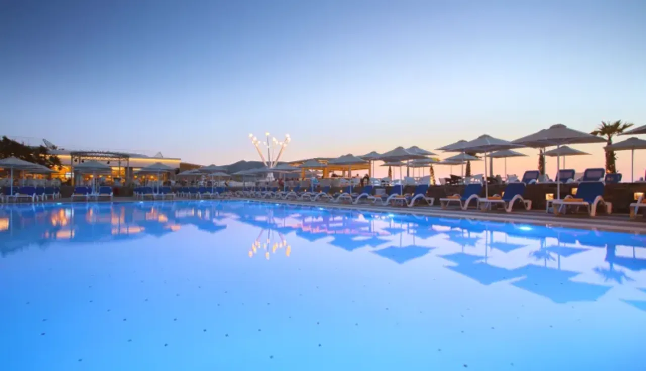 Equipements : Réception 24 h/24 / Connexion Wifi / 2 restaurants / Bar de la piscine / Bars / 3 piscines extérieures pour adultes et 2 pour enfants / Plage privée / Parc aquatique avec toboggans pour adultes et enfant / Spa Aegeo avec sauna, massage (en supplément), piscine intérieure chauffée / Salle de sport ouverte de 8 h à 20 h / 2 courts de tennis / Beach-volley