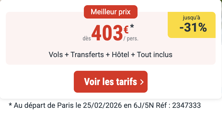 Les transferts et les vols A/R directs viennent compléter ce package ultra easy. Et tout cela pour 403€ par personne, un rapport qualité-prix très difficile à battre pour l’Égypte. Une escapade solaire qui mélange détente, confort et mer turquoise du matin au soir. 💙