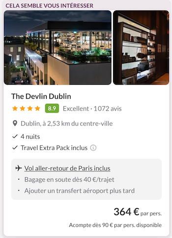 💞 Vous séjournerez dans un hôtel design au cœur de la ville : The Devlin Dublin. Situé dans le quartier chic de Ranelagh, à quelques minutes du centre historique, l’hôtel dévoile une atmosphère feutrée et contemporaine : chambres compactes mais ultra confortables, literie douillette, ambiance tamisée et touches de design industriel.